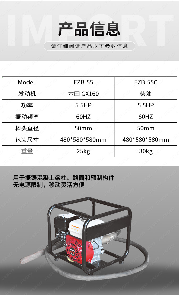 用于振鑄混凝土梁柱、路面和預制構(gòu)件。 無電源限制,移動靈活方便。