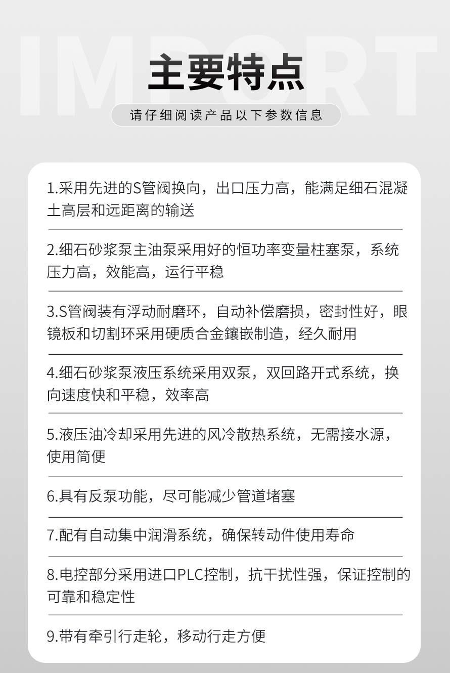 25型二次構(gòu)造柱專用輸送泵是一種復(fù)合泵送要求的混凝土泵,通過水平或垂直安裝的管道,連續(xù)輸送到澆注現(xiàn)場的細石混凝土輸送設(shè)備。 廣泛應(yīng)用于二次構(gòu)造柱填充、地暖工程、屋面、高層建筑的墻、水庫、水電站、港口、碼頭、基礎(chǔ)處理 軟弱地基 加固注漿 隧
