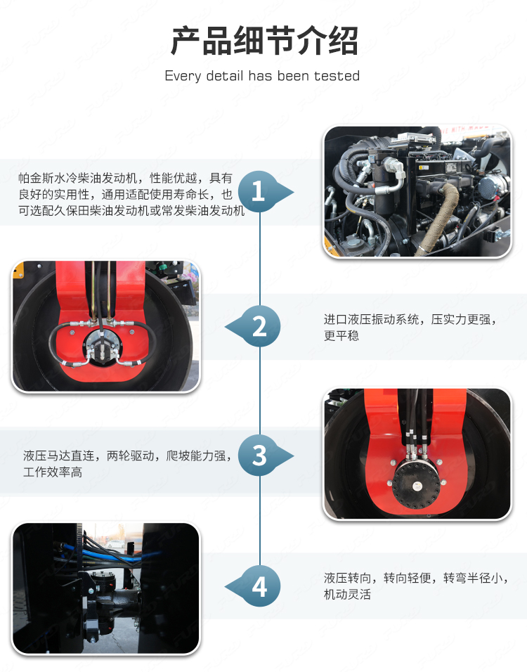 FYL-1400T為橡膠輪胎振動(dòng)壓路機(jī),該壓路機(jī)前有鋼輪,后有橡膠輪,結(jié)合鋼輪和輪胎壓路機(jī)的優(yōu)點(diǎn),具有更高的工作效率。